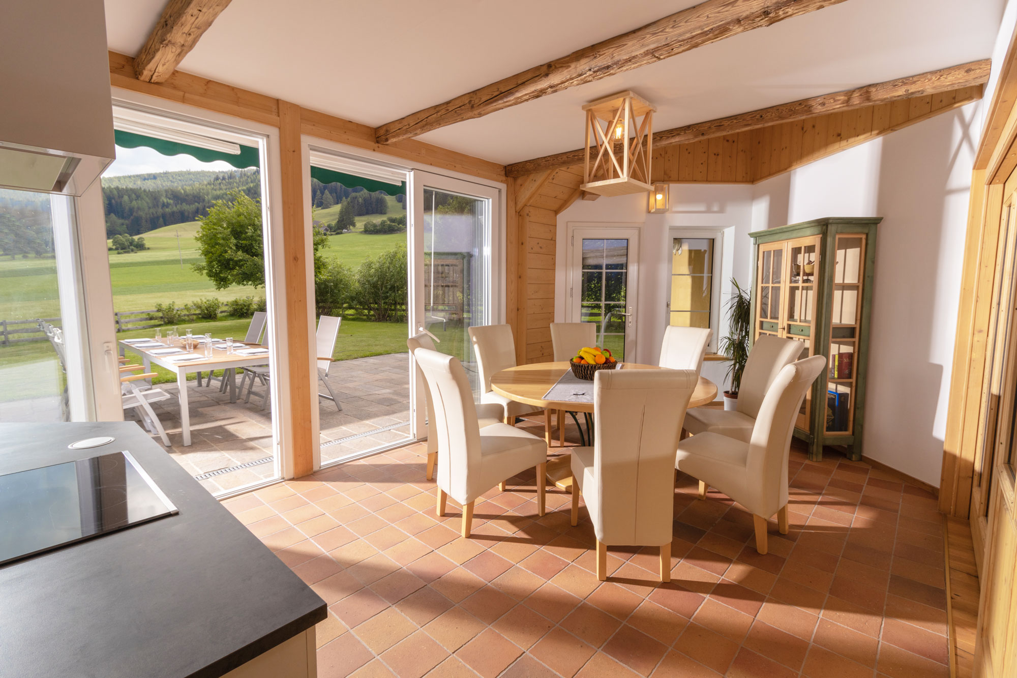 Eines der 3 Schlafzimmer enthält zum Doppelbett ein Schlafsofa sowie ein separates, modernes Duschbad, die Gäste der anderen beiden Schlafzimmer teilen sich ein Bad mit jeweils separater Gästetoilette und Bidet. Der weiträumige Essbereich mit offener und komplett ausgestatteter Küche mit Nespressomaschine grenzt an die 60 Qudratmeter große Terrasse mit herrlichem Blick auf die Lungauer Bergwelt.